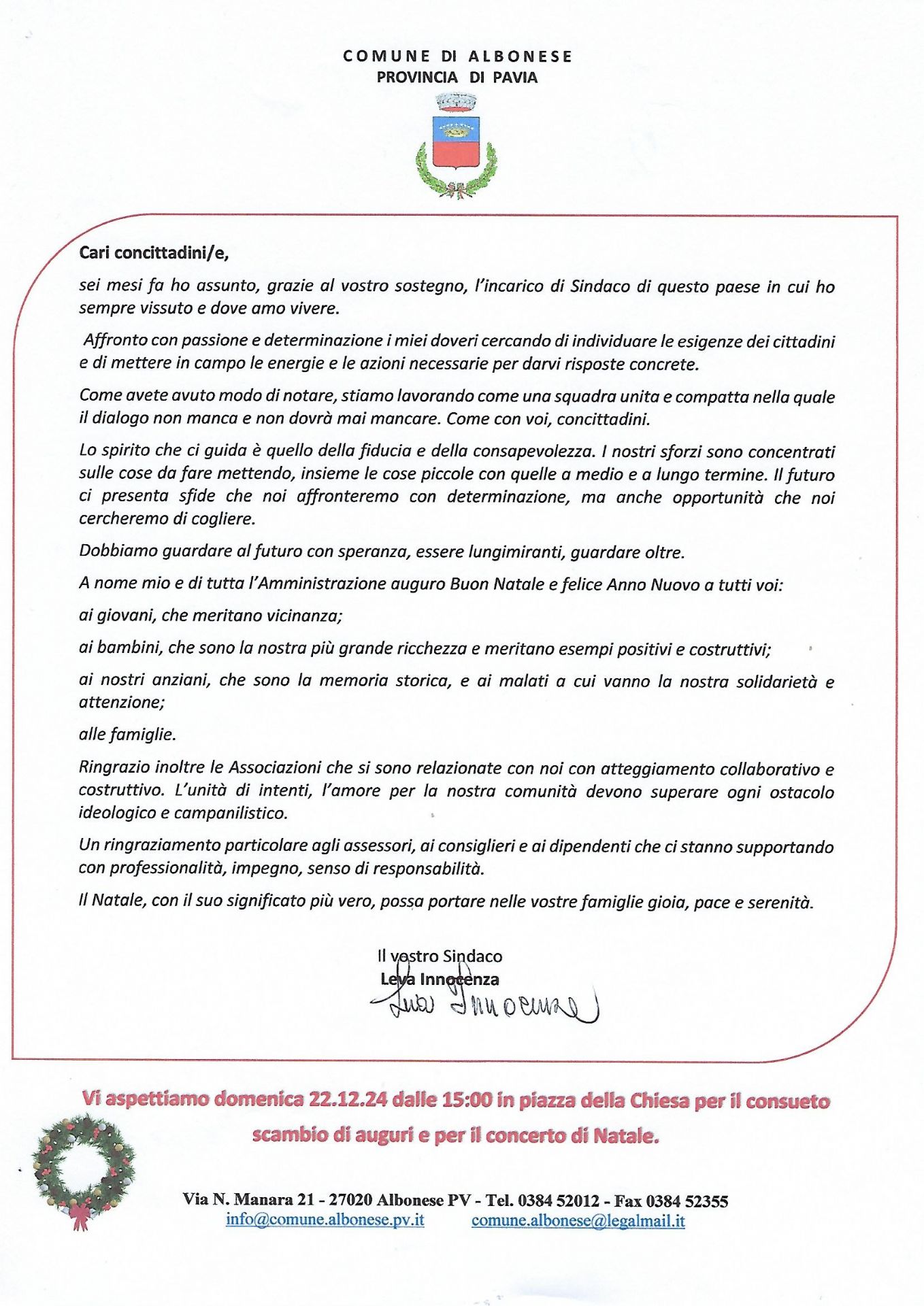 Lettera del Sindaco